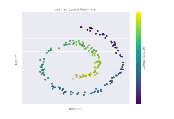 # Notice that the colors (which represent the extracted one-dimensional latent variable) change uniformly along the spiral, which indicates that the algorithm did in fact detect the structure we saw by eye.