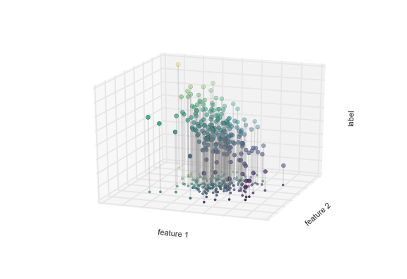 # Notice that the *feature 1-feature 2* plane here is the same as in the two-dimensional plot from before; in this case, however, we have represented the labels by both color and three-dimensional axis position.