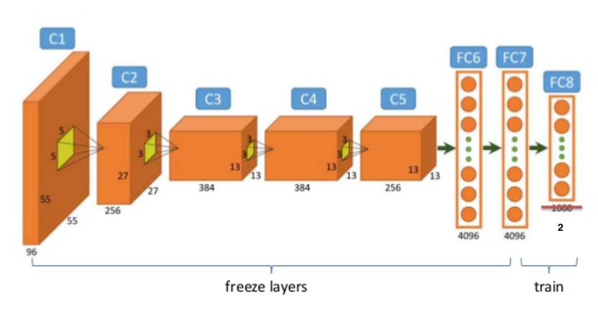 ConvLearner.pretrained builds learner that contains a pre-trained model. The last layer of the model needs to be replaced with the layer of the right dimensions. The pre-trained model was trained for 1000 classes therfore the final layer predicts a vector of 1000 probabilities. The model for cats and dogs needs to output a two dimensional vector. The diagram below shows in an example how this was done in one of the earliest successful CNNs. The layer "FC8" here would get replaced with a new layer with 2 outputs.