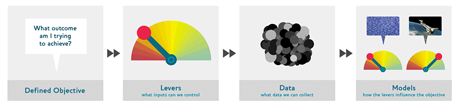 We use data not just to generate more data (in the form of predictions), but to produce actionable outcomes. That is the goal of the Drivetrain Approach. Start by defining a clear objective. For instance, Google, when creating their first search engine, considered "What is the user’s main objective in typing in a search query?" This led them to their objective, which was to "show the most relevant search result." The next step is to consider what levers you can pull (i.e., what actions you can take) to better achieve that objective. In Google's case, that was the ranking of the search results. The third step was to consider what new data they would need to produce such a ranking; they realized that the implicit information regarding which pages linked to which other pages could be used for this purpose. Only after these first three steps do we begin thinking about building the predictive models. Our objective and available levers, what data we already have and what additional data we will need to collect, determine the models we can build. The models will take both the levers and any uncontrollable variables as their inputs; the outputs from the models can be combined to predict the final state for our objective.